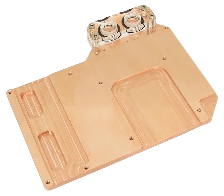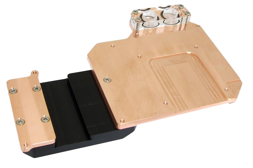 Dieser Kühler vereint die Funktionen von Grafikchipkühler, Speicher- und Spannungsreglerkühlern in einem eleganten und sehr flachen Wasserkühler. Dadurch bleibt auch der nächste neben dem PCI-Express-Slot vorhandene Steckplatz verwendbar.