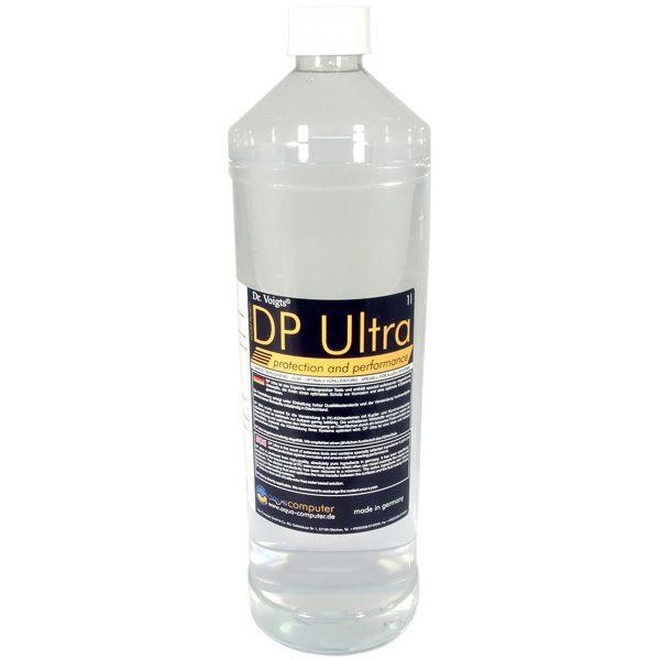Double Protect Ultra basiert auf einem Gemisch von speziell deionisiertem Wasser, Mono-Ethylenglykol und Inhibitoren. Diese Zusammensetzung ist recht gebräuchlich, wurde von uns aber auf die Anwendung hin optimiert. Wir konnten gerade bei Alu-Kupfermischsystemen sehr gute Ergebnisse erzielen was den Korrosionsschutz der Mischung angeht. Zudem ist DP Ultra sehr gering elektrisch leitend, was die Möglichkeit von Kurzschlüssen durch Spritzer und ähnliches start reduziert. DP Ultra wurde direkt von Aqua Computer in Zusammenarbeit mit Dr. Tobias Voigt entwickelt. DP Ultra erzielt im Vergleich zu anderen angebotenen Fertigmischungen sehr gute Kühlleistungen und verbessert durch seine Inhaltsstoffe das Fließverhalten.